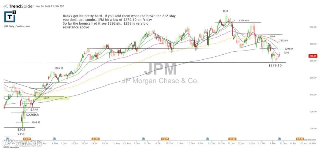 银行股整体承压。JPM上周五最低触及279.10。若现反弹,首看292;295上方为强阻力区。