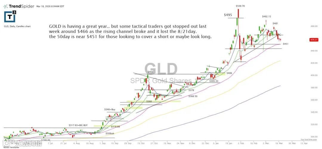黄金年内表现强劲,但短线交易者在上周466跌破上升通道及失守8/21日均线时遭遇止损。当前50日均线位于451附近,是空单回补或多头关注的关键位置。