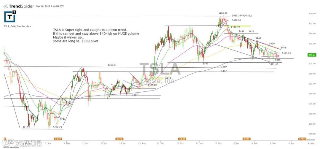TSLA当前呈紧凑下行结构。若放量并有效站稳404,有望扭转颓势;389为部分投资者的枢轴多单入场位。