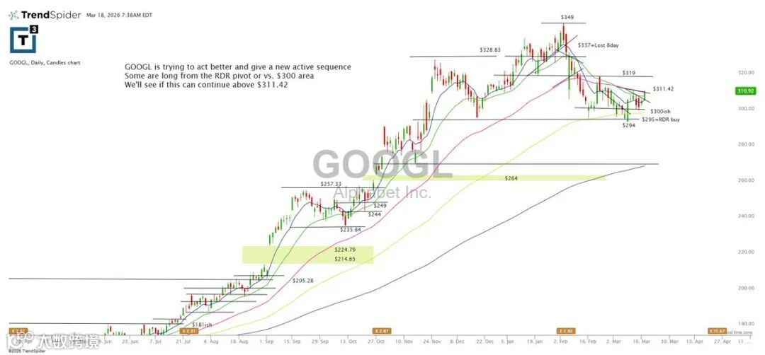 GOOGL尝试走强并构建新活跃结构,部分资金于RDP枢轴位或300区域布局。关键观察点为能否持续站稳311.42上方。