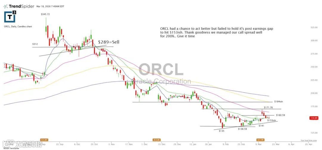 ORCL未能守住153财报后缺口,但通过期权价差策略已将风险控制在200区域附近,后续需时间修复结构。