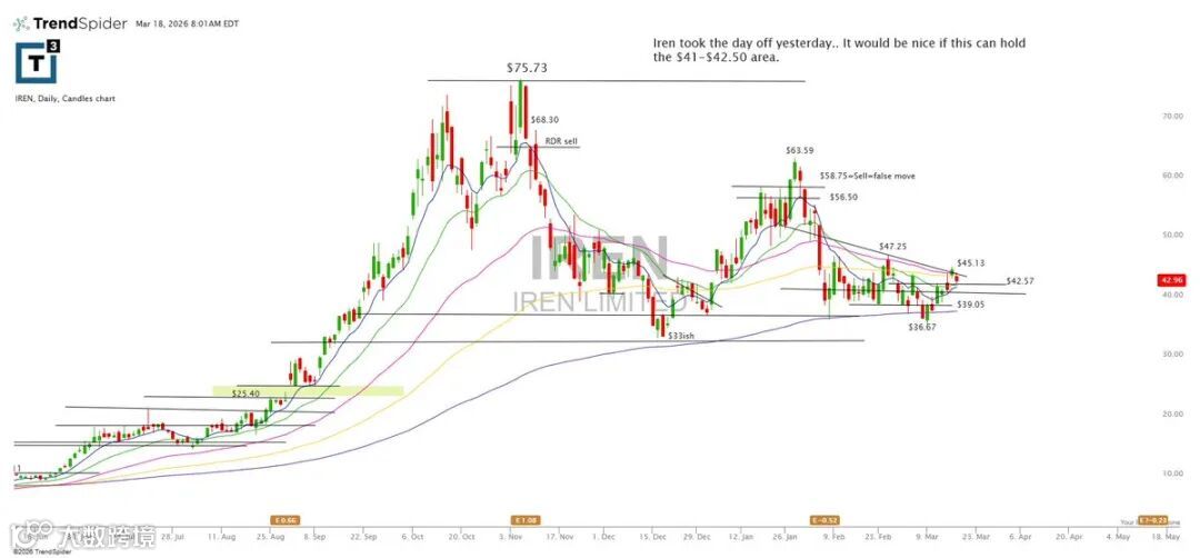 IREN昨日完成整理,若能守住41–42.50区间,技术形态将趋于理想。