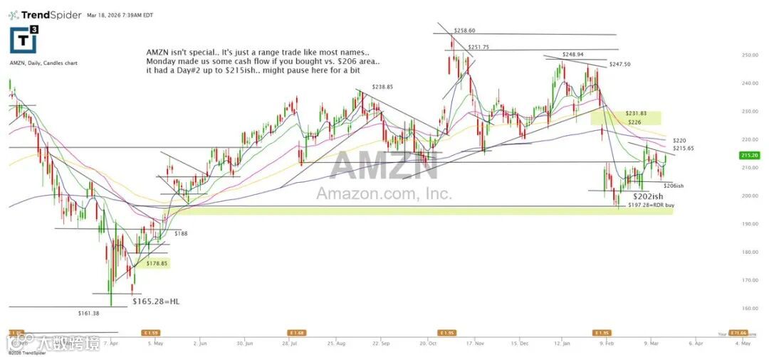 AMZN处于典型区间震荡格局。周一于206附近介入可获较好现金流,短期反弹至215后或延续震荡整理。