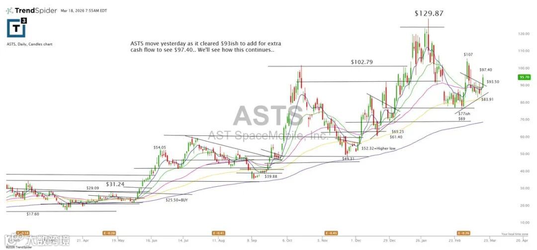 ASTS昨日突破93,构成加仓信号,目标位97.40。后续走势值得持续跟踪。