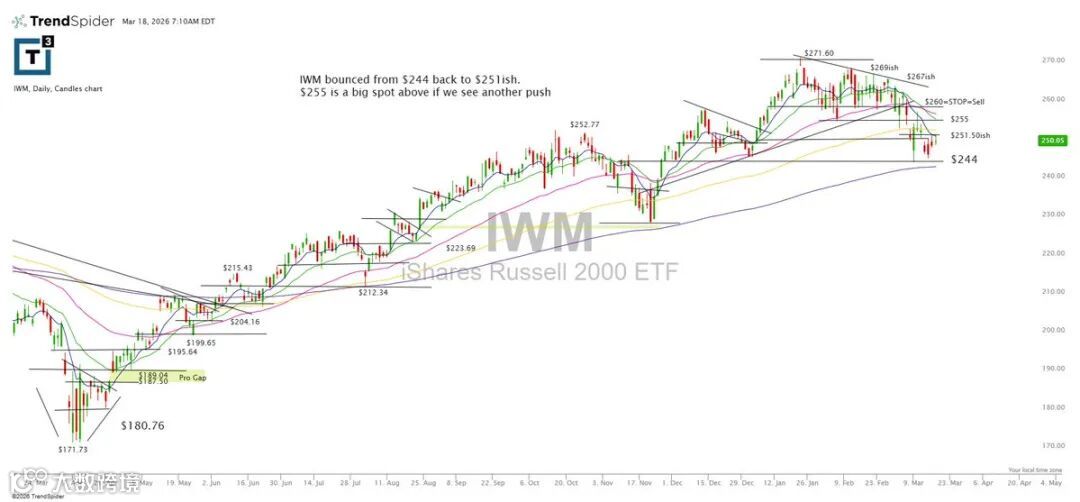 IWM由244反弹至251。若进一步上行,255为关键压力位。