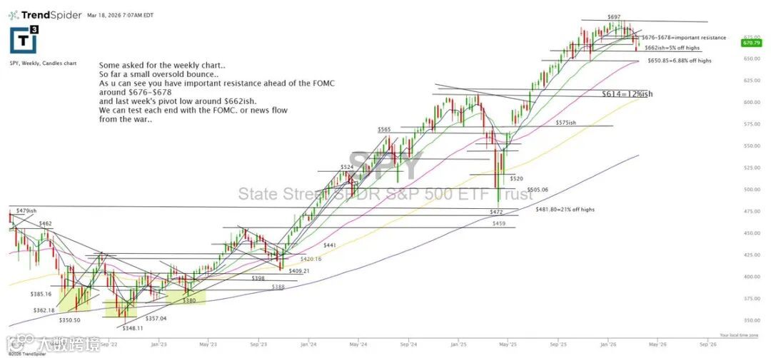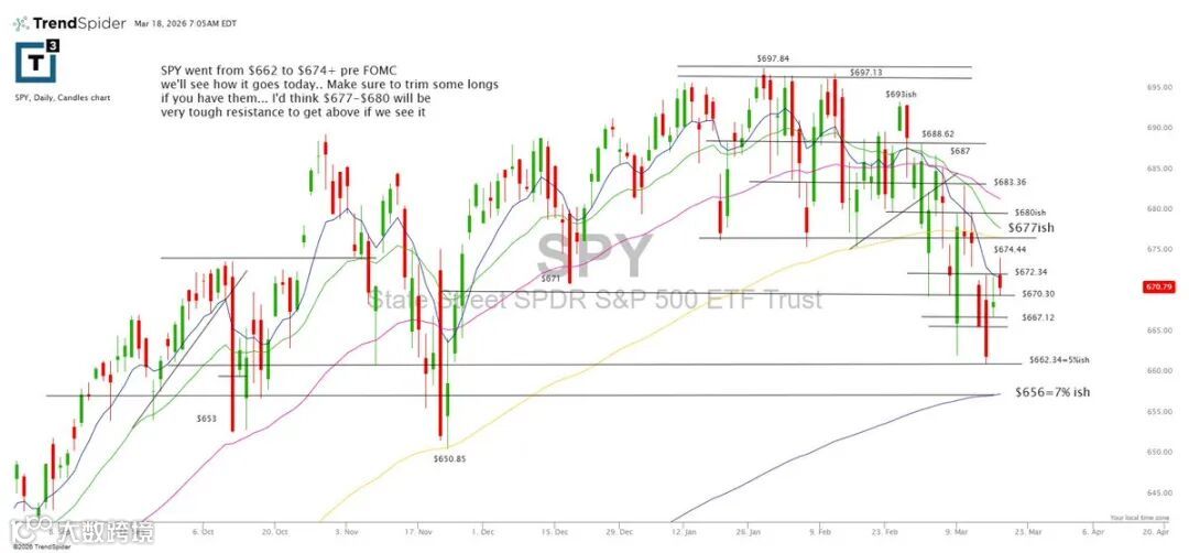 SPY自662上行至674以上,临近FOMC会议。建议持仓者逢高部分减仓。若反弹至677–680区间,将面临显著阻力,突破难度较大。