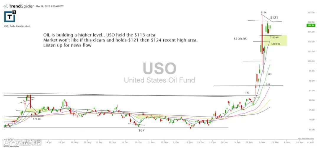 原油正构建更高级别结构,USO守住113支撑。若突破并站稳121,有望挑战前高124区域,走势对消息面高度敏感。