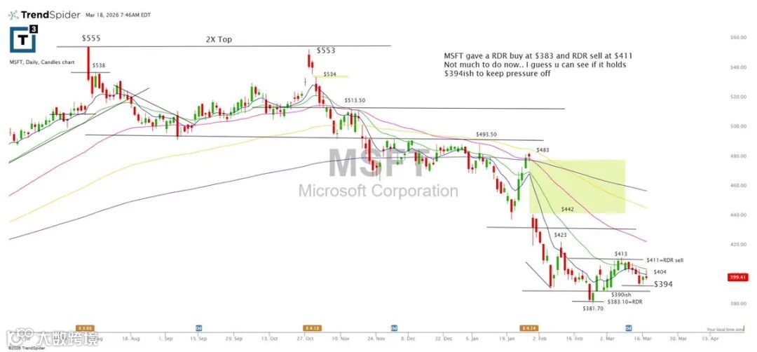 MSFT此前在383出现RDR买点,411出现RDR卖点,当前处于消化阶段。重点观察是否能守住394附近以缓解下行压力。