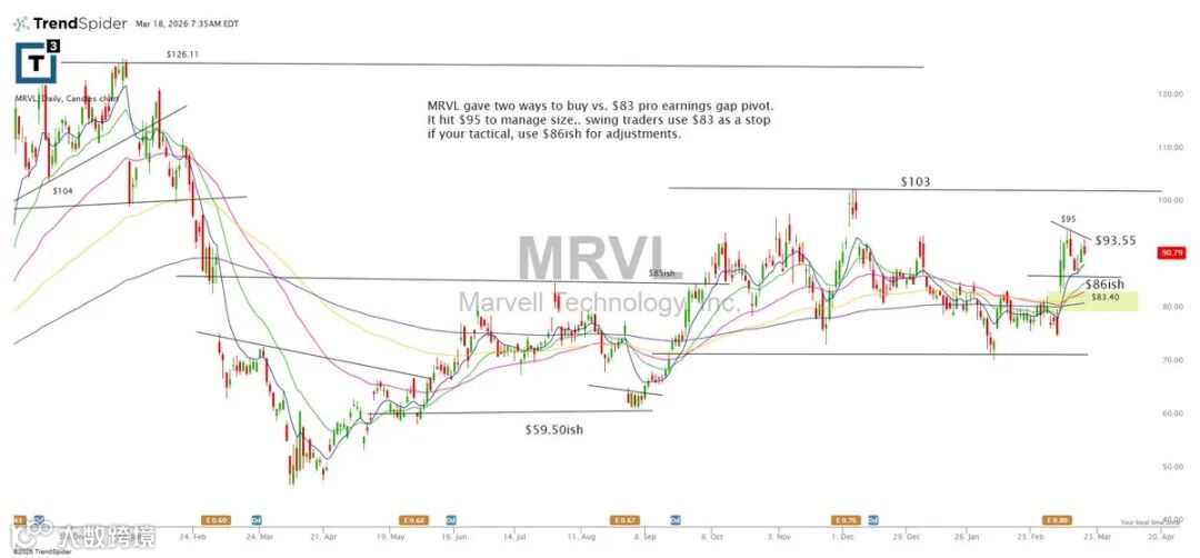 MRVL提供两种入场方式:一为财报前83美元缺口枢轴位;二为突破95美元后加仓。波段交易者可将83设为初始止损,灵活者可视86上方为动态调整参考。
