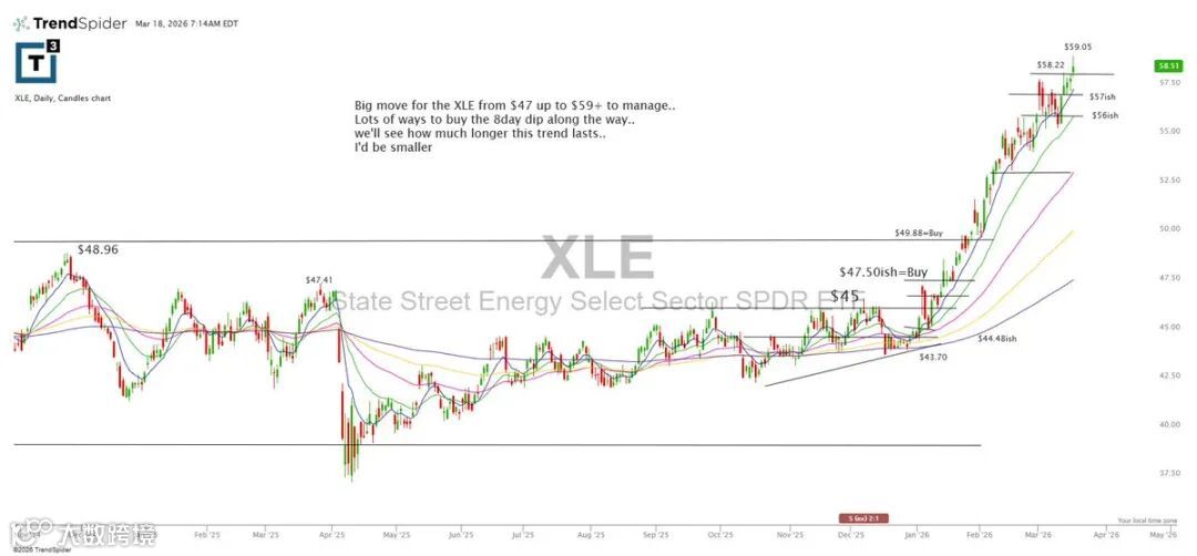 XLE自47升至59以上,形成明显趋势行情,期间多次沿8日均线提供低吸机会。后续关注趋势延续性,建议适当控制仓位。