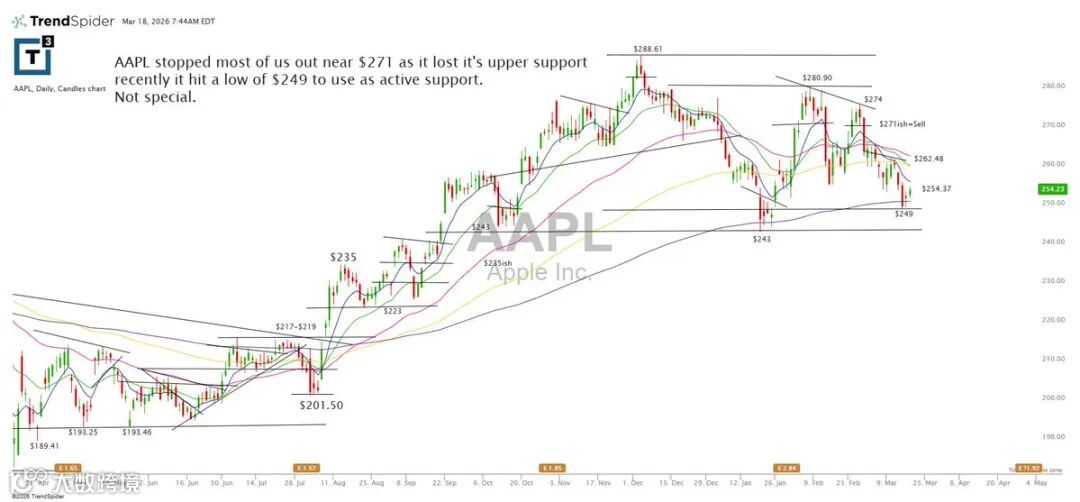 AAPL近期跌破271关键支撑,最低下探至249,该位置可视为短期活跃支撑,整体缺乏明确方向性亮点。