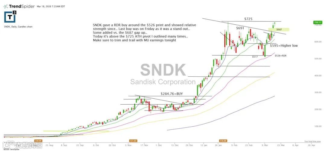 SNDK曾在526出现RDR买点,此后持续强势。上周五再现买点,昨日已站上725历史高点枢轴位。MU财报前建议适度减仓并上移止盈位。