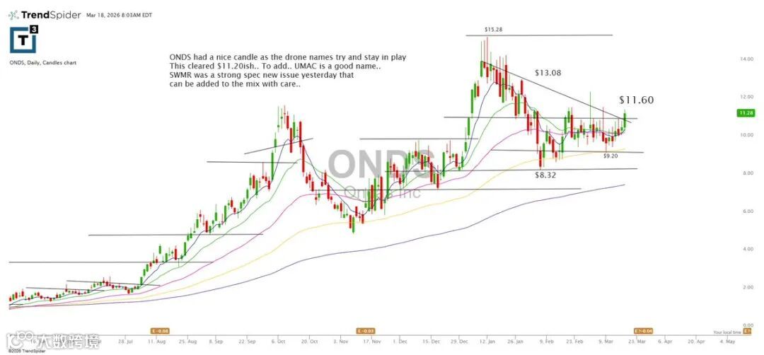 ONDS昨日走出强势K线,作为无人机概念股重新活跃。突破11.20可考虑加仓。UMAC、SWMR亦表现突出,可纳入谨慎观察名单。
