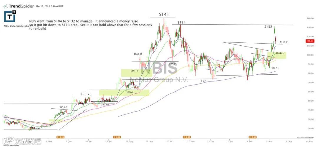 NBIS自104涨至132后进入整理,融资公告致其回落至113附近。后续观察该位置能否企稳并重建结构。