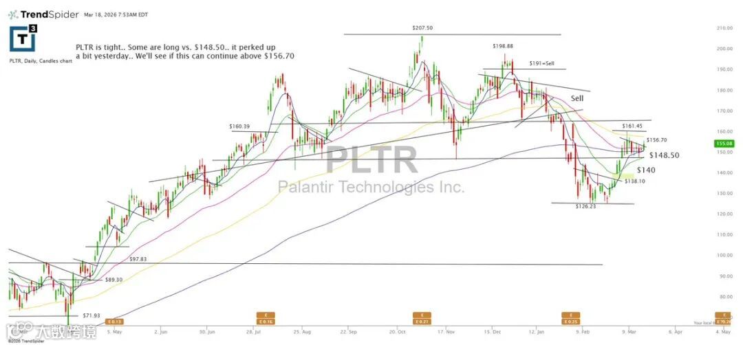 PLTR结构紧凑,部分资金于148.50布局。昨日略有走强,下一步需确认是否能持续站稳156.70上方。