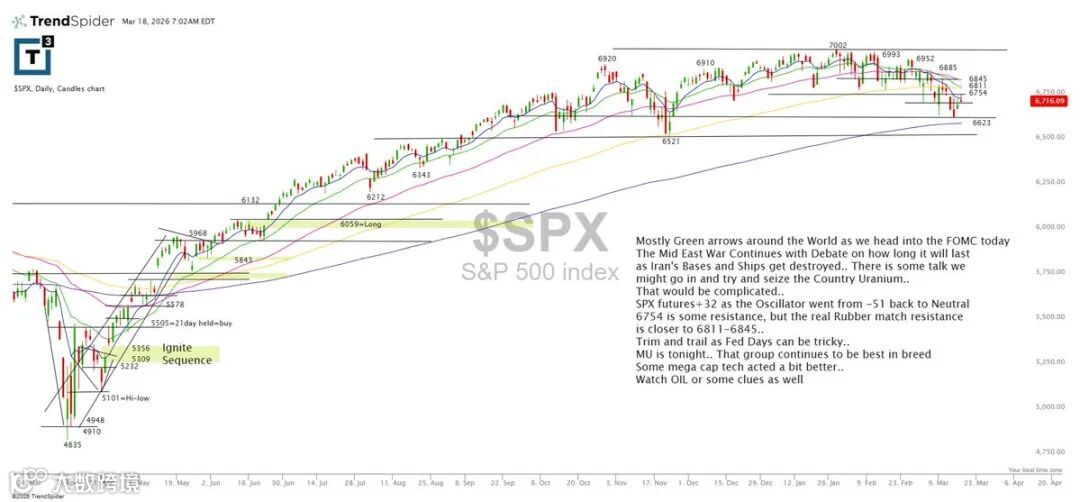 全球多数市场走弱,焦点集中于今日美联储FOMC议息会议。中东地缘局势持续发酵,伊朗军事设施及舰船遭袭影响尚待评估;另有消息称伊朗未从中国获得浓缩铀,可能加剧局势复杂性。标普500期货上涨32点,震荡指标由-51回升至中性区域。短期阻力位于6754,强阻力区间为6811–6845。MU将于今晚公布财报,半导体板块仍是当前市场最强主线,部分超大盘科技股亦表现稳健。油价走势亦需重点关注。