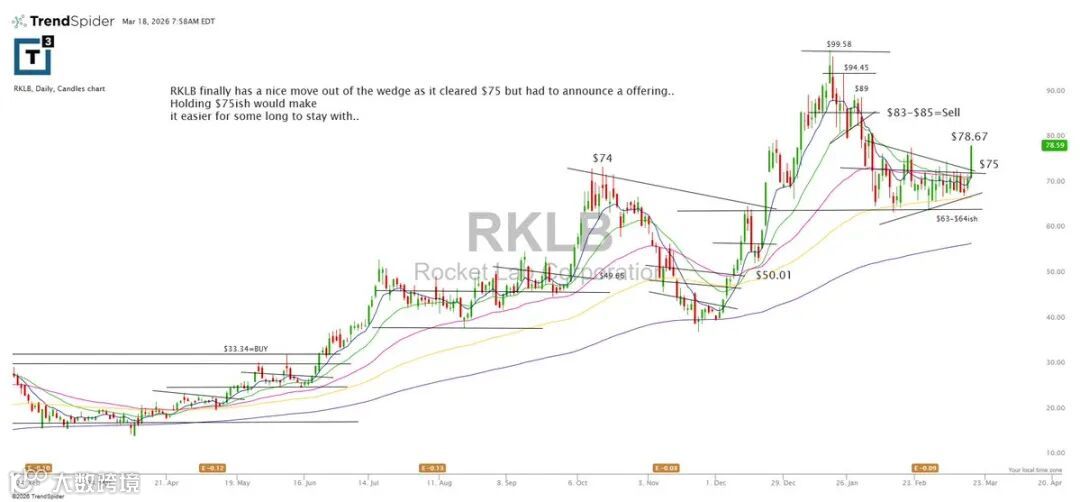 RKLB成功突破楔形结构并站上75,但随即公告增发,股价承压。若75能有效守住,有利于多头信心维系。