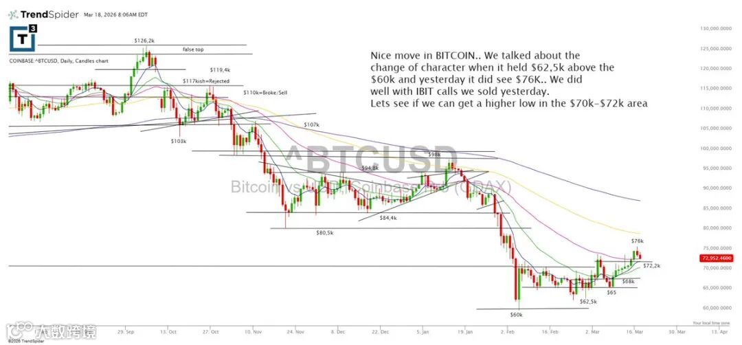 比特币延续强势上涨,此前站稳6.25万美元并守住6万美元,结构已发生积极变化,昨日一度触及7.6万美元。此前布局的看涨期权已顺利止盈。下一阶段关注7万–7.2万美元区间是否能形成更高低点。