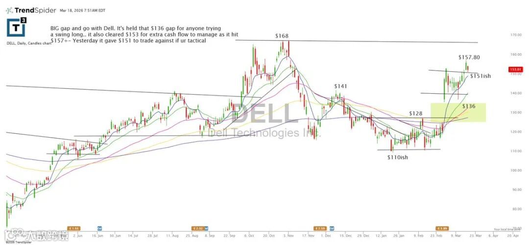 DELL形成向上跳空并延续走势,136缺口获有效支撑,153突破带来额外空间。上冲至157+后利于仓位管理;昨日151一带亦提供战术性操作机会。