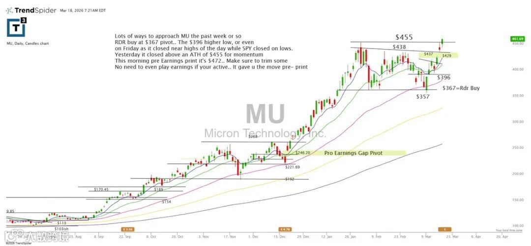 MU近期呈现多维参与机会:RDR买点约367;396为更高低点;上周五在SPY收跌背景下仍收于当日高位;昨日收盘站上455历史高点,动能强劲,盘前已触及472+。财报前建议减仓,超短线交易者可规避财报不确定性。