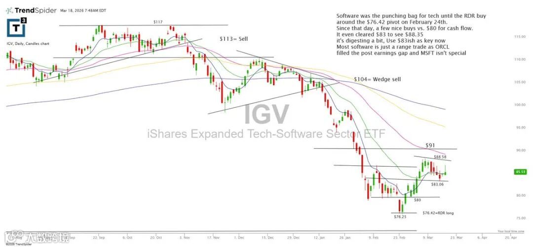 软件板块2月24日在76.42出现RDR买点后逐步回暖。此后在80、83等位提供交易机会,目前已突破83–88.35区间,进入整理阶段。83为当前关键参考位;ORCL已回补财报缺口,MSFT表现相对平淡。