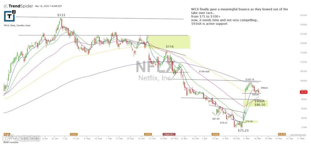 NFLX结束前期急速下跌后出现有力反弹,由75升至100以上,当前进入整理阶段。93为活跃支撑位,整体吸引力仍待提升。