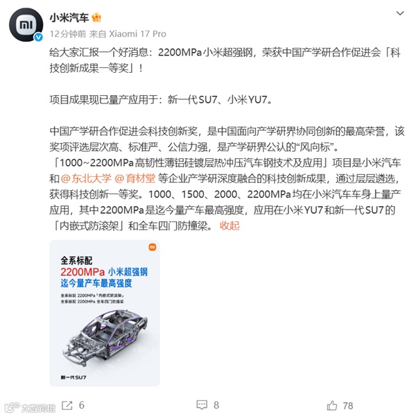 小米汽车宣布,其自主研发的2200MPa小米超强钢荣获中国产学研合作促进会“科技创新成果一等奖”,目前已量产应用于新一代SU7和小米YU7车型。