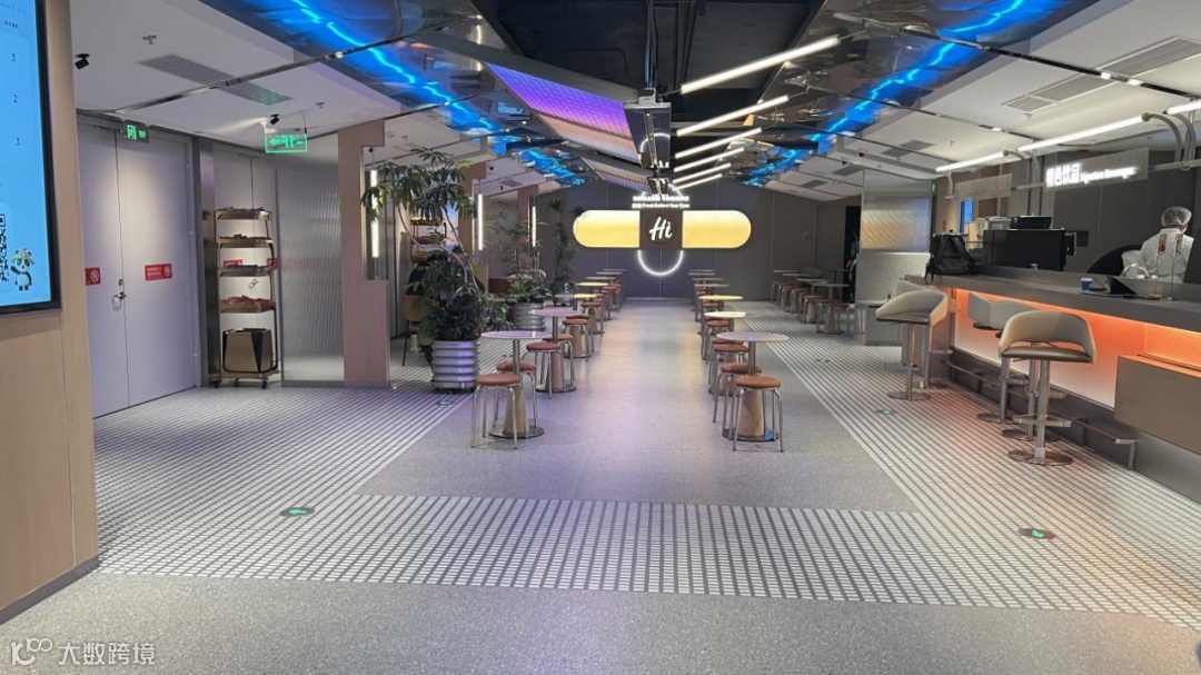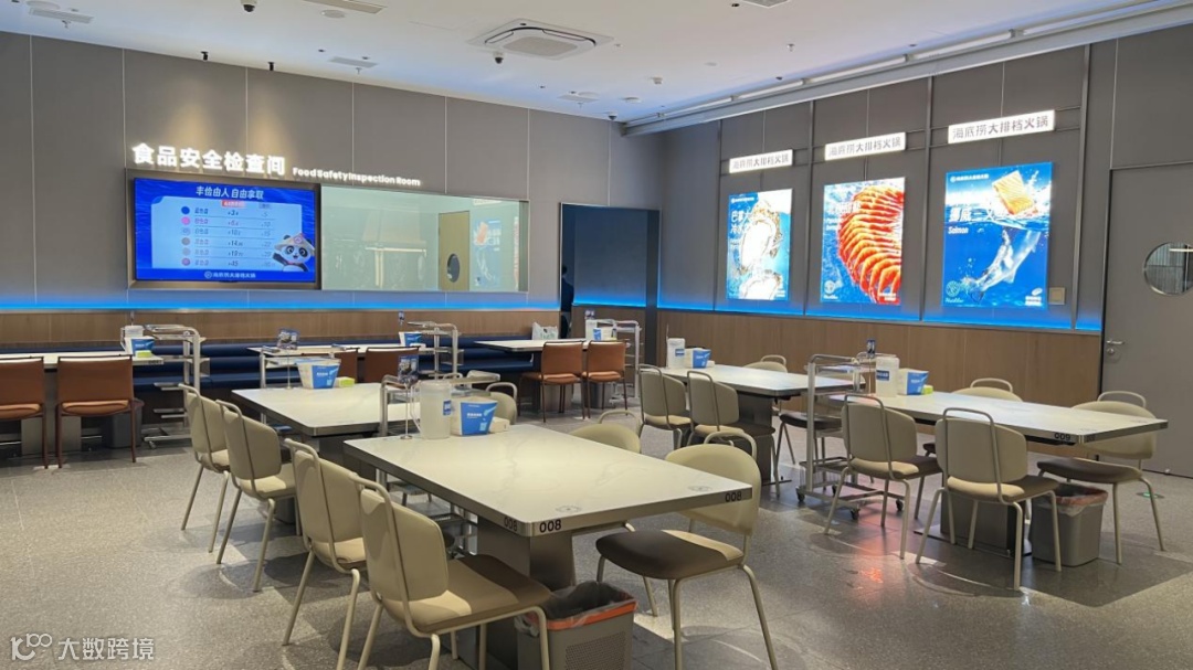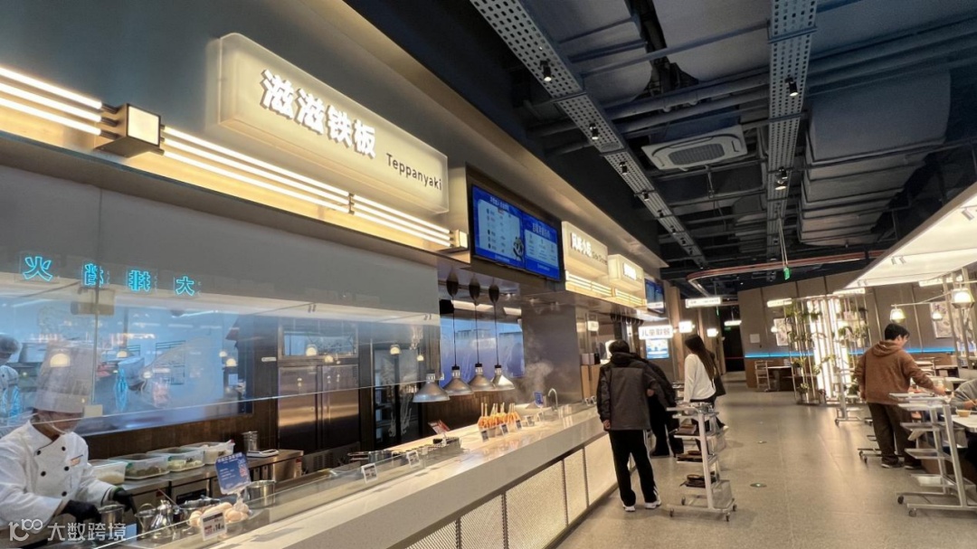 门店配置约300名员工,各区域均有专人值守;餐盘回收由服务员主动完成,结账通过专用设备扫描回收筐自动计价;人均消费约100元。