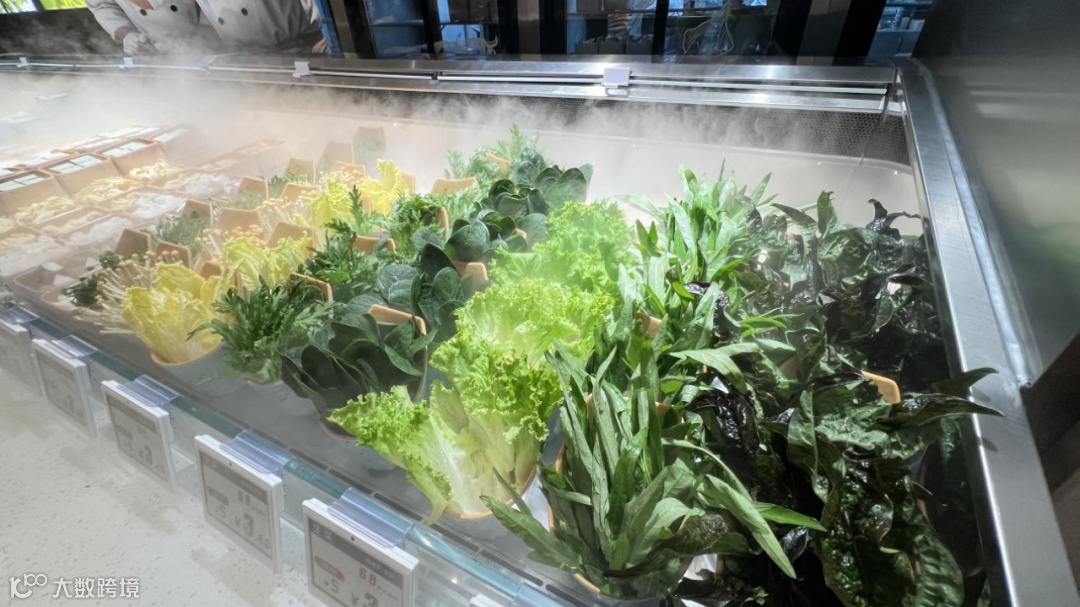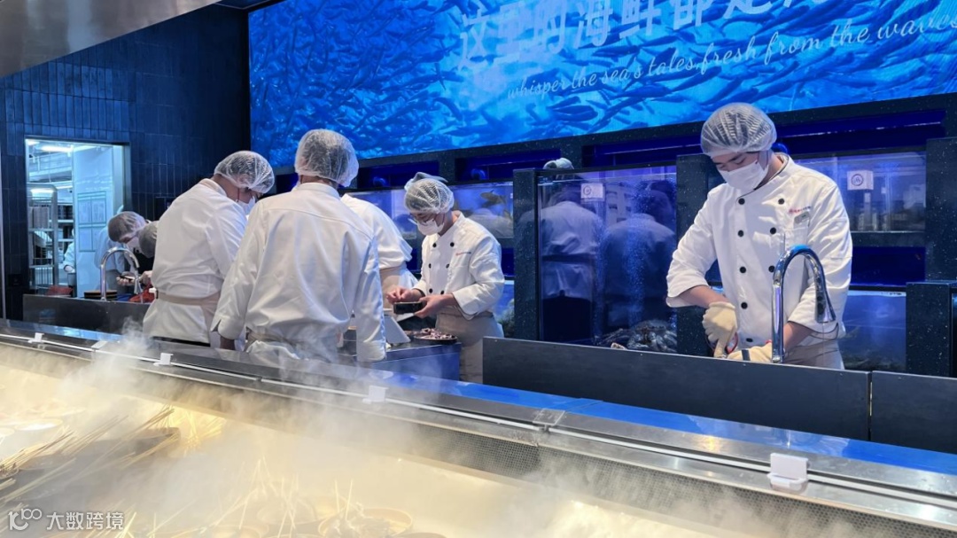 食材端打造“生鲜市集式”体验:SKU超200个,涵盖铁板区、鲜切区、海鲜区、水果饮品区等功能板块;采用“前店后厂”透明动线——海鲜现捞现处理、牛肉现场鲜切。海鲜区新增20余款产品,加工全程可视可感。