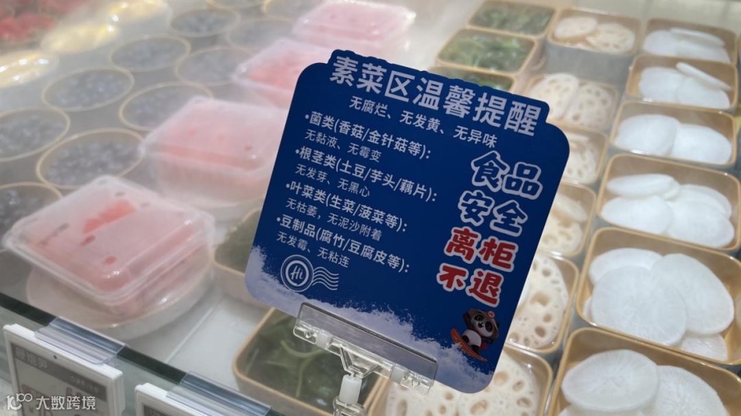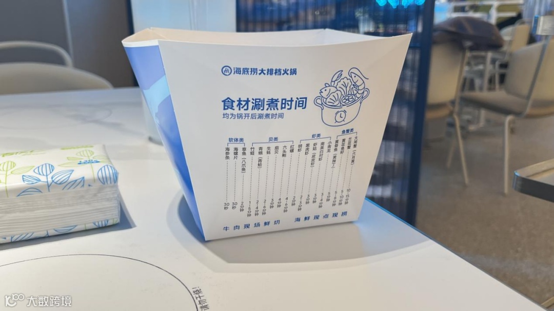 服务细节兼顾实用与体验:取餐区设儿童专区及儿童围裙;墙面张贴海鲜食用指南;每桌配备标注涮煮时长的分类垃圾桶;单人火锅加热面板附“小心烫手”提示。