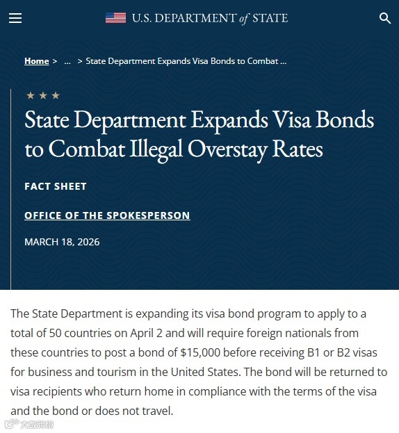 保证金金额由领事官员根据申请人具体情况裁量,分5000、10000、15000美元三档。政策将于2026年4月2日正式生效。