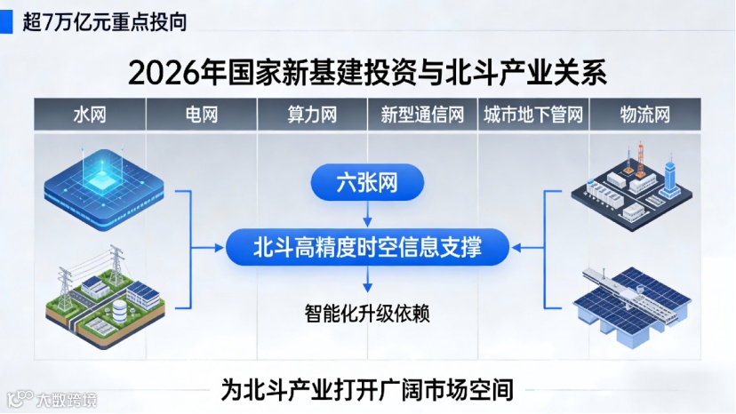 2026年国家明确超7万亿元新基建投资,重点投向水网、电网、算力网、新型通信网、城市地下管网、物流网“六张网”。每一张网的智能化升级,均需北斗高精度时空信息支撑。