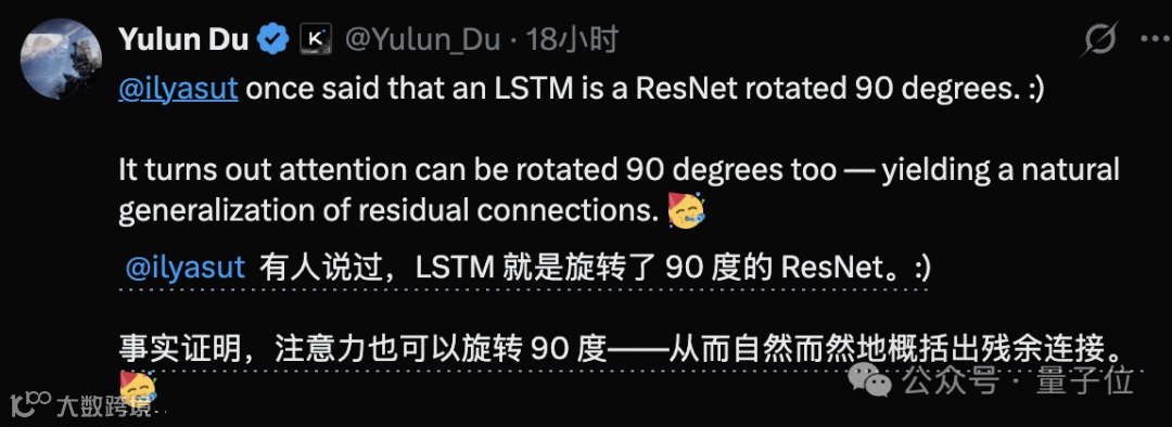 Ilya曾指出:将按时间顺序处理信息的LSTM“旋转90度”,即把时间维度替换为网络深度维度,就可导出残差连接。Kimi团队进一步推演:既然LSTM对应残差,那么取代LSTM的注意力机制,也应在深度维度上实现“旋转”。