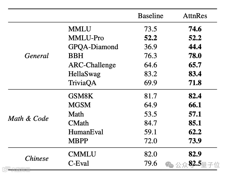 在Kimi Linear 48B(MoE架构,3B激活参数)上验证表明:同等算力预算下,Attention Residuals显著提升下游任务性能;达到相同效果所需训练计算量减少约20%,即效率提升1.25倍。