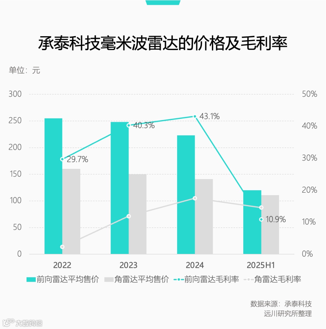 伴随新能源汽车价格战持续升级,承泰主力产品——第5.5代4D高分辨率毫米波雷达单价大幅下滑,前向雷达售价较此前腰斩;毛利率同步承压,单颗利润不足20元,仅相当于一杯奶茶价格。