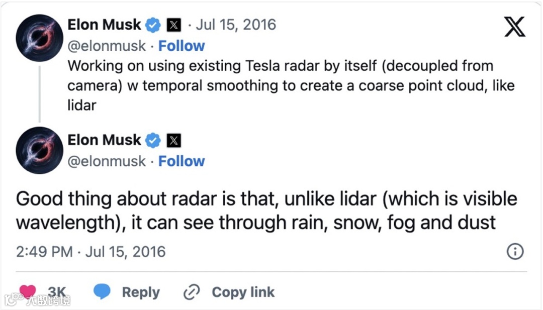特斯拉最终选择毫米波雷达而非激光雷达,主因成本:彼时激光雷达单价上万美元,而毫米波雷达仅需数百美元即可量产上车。
