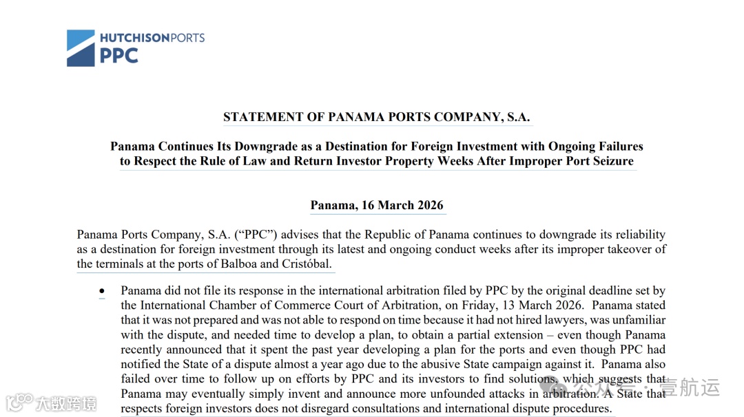 据悉,当地时间3月16日,香港长和集团旗下的巴拿马港口公司(Panama Ports Company, S.A., PPC)发布声明称,巴拿马政府未在国际商会仲裁法院(ICC Court of Arbitration)设定的原定截止日期(2026年3月13日)前提交仲裁回应。