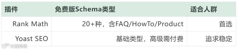 Rank Math免费版已覆盖FAQ、Product、Article、Organization等主流Schema需求,无需付费升级。