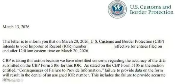而3月13日,CBP发布重磅通知,宣布自3月20日美东时间凌晨12:01起,大批不合规IOR编号将正式作废。