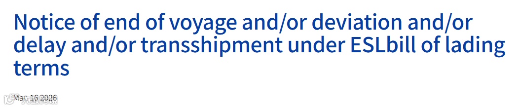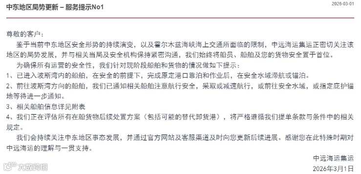 涉及阿拉伯联合酋长国、沙特阿拉伯王国(达曼港、朱拜勒港)、伊拉克、巴林、科威特、卡塔尔和阿曼的货物运输,根据实际情况调整船舶航行计划,必要时在备用港口卸货,根据实际情况调整运营安排。所有行动均按照公司提单第9条执行,并受适用的不可抗力条款的约束。