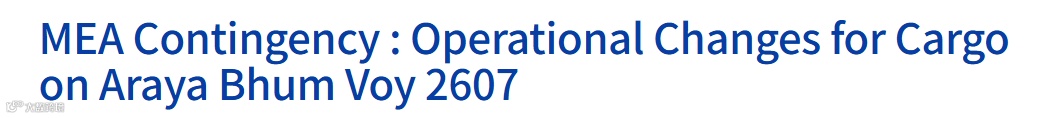 即日起对 ARAYA BHUM V.2607 航次的货物运输进行调整。船舶将改道印度纳瓦舍瓦(Nhava Sheva)港进行卸货或转运,由此产生的风险和部分费用需由托运人承担。