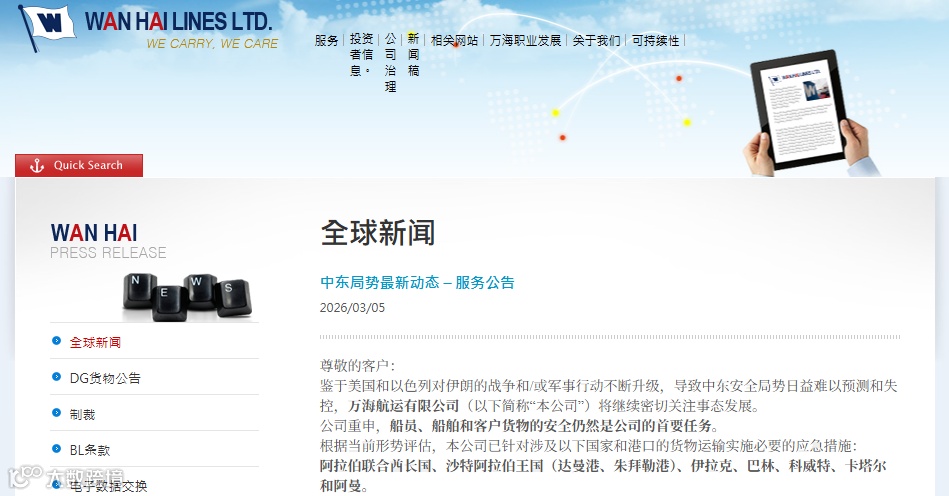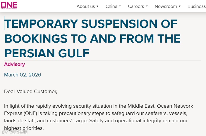 3月2日,海洋网联船务(ONE)发布公告,即日起,将临时暂停接受往返波斯湾地区的新货物预订,暂停时间直至另行通知。