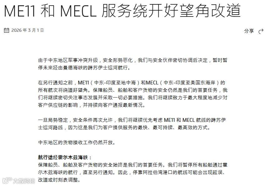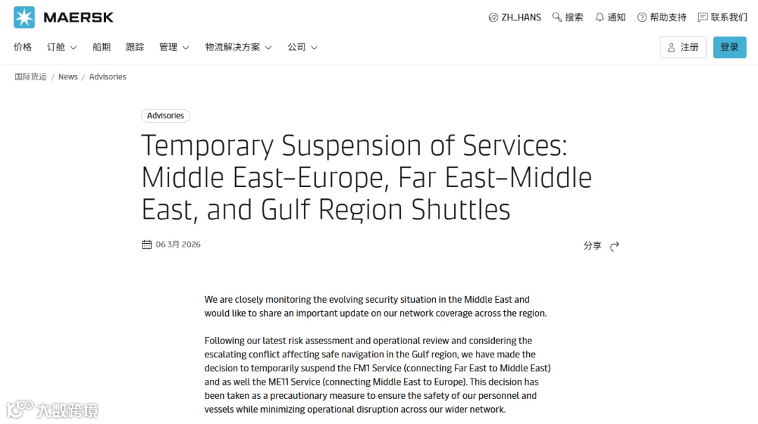 途经中东地区和霍尔木兹海峡的各航线/船舶的应急预案和最新进展,请至马士基官网公告页面查看。
