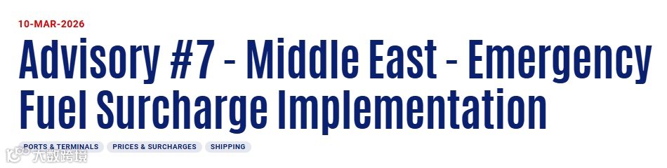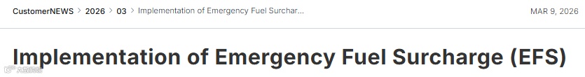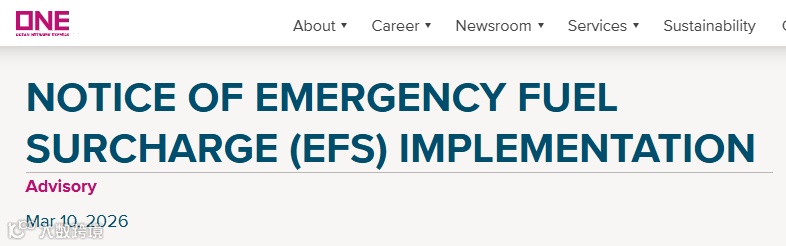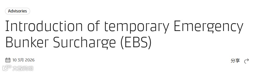 全球范围内将征收临时紧急燃油附加费(EBS),生效时间:非FMC管辖货物:2026年3月23日生效(需监管批准)、FMC管辖货物:2026年4月13日生效。