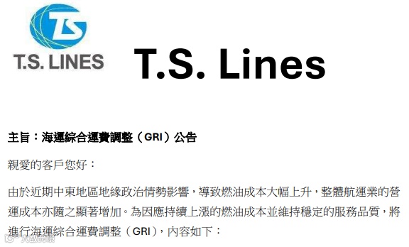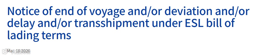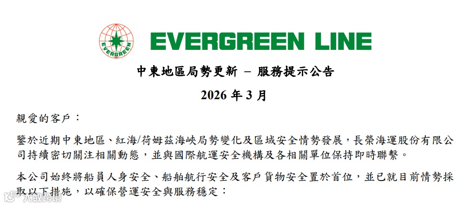 3月17日,以星航运发布通告,由于保险公司提高了对所有停靠以色列港口的船舶(包括以星航运公司的船舶)征收的战争风险保险费,自2026年4月4日起(直至另行通知),以星往返以色列所有货物的战争险附加费(WRP) 调整如下: