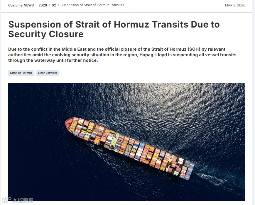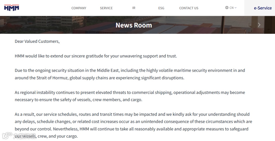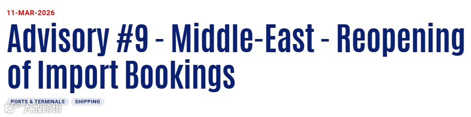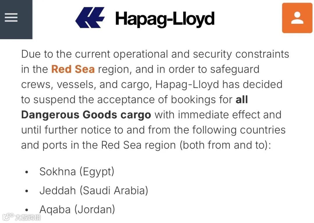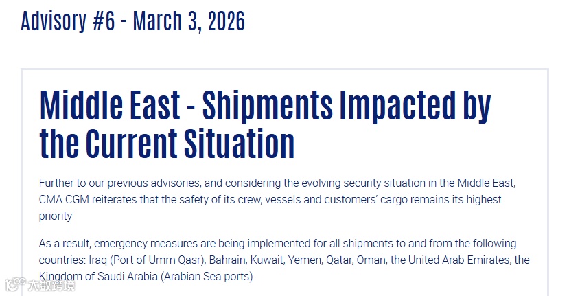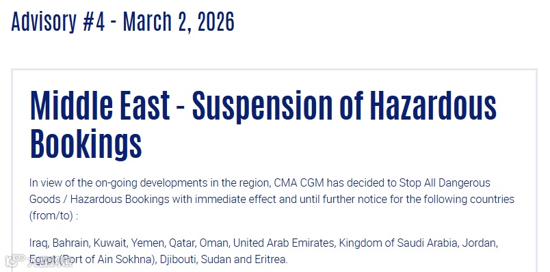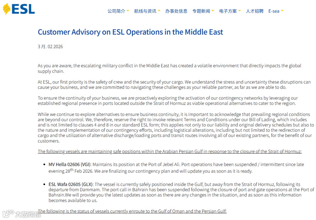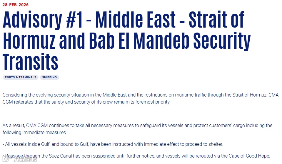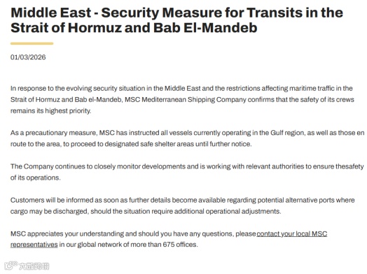 已指示所有在霍尔木兹海峡和曼德海峡水域运营,以及正在驶往该水域的船舶,前往指定安全水域抛锚待命,已订舱货物可能面临改港或延误。