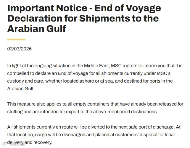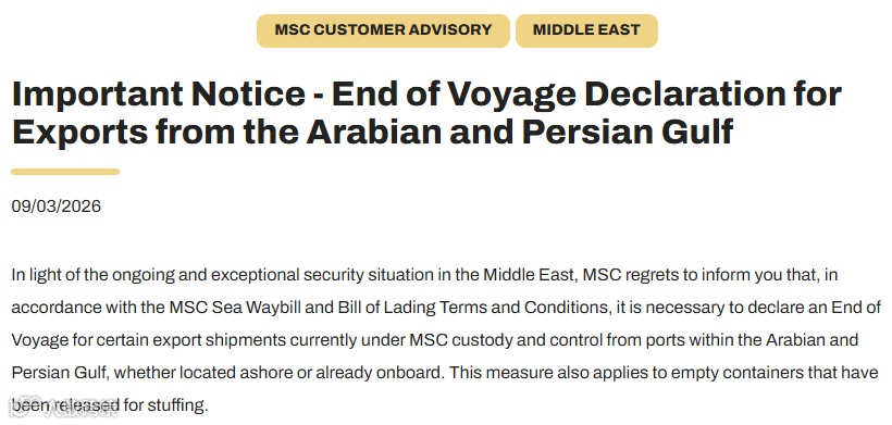 目前由MSC掌管、从阿拉伯湾及波斯湾各港口发出的部分出口货物(无论已在岸上或已装船),终止本次航程,同样适用于已发放用于装货的空集装箱。
