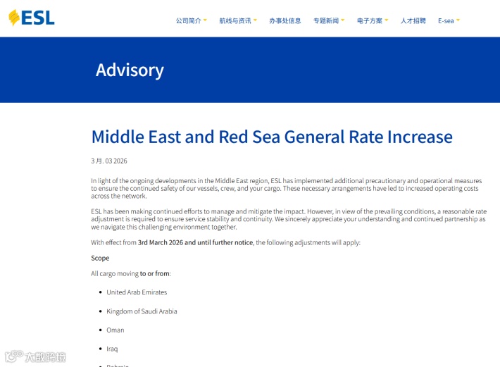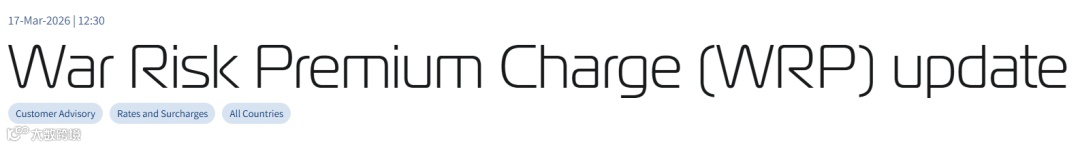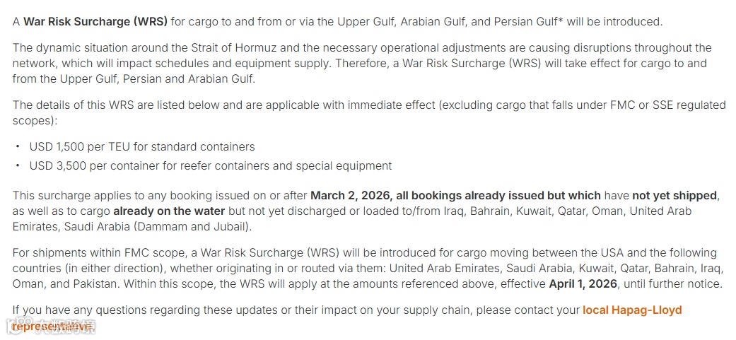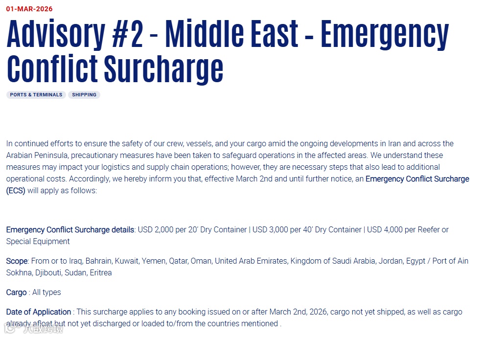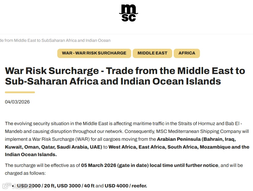 对所有从阿拉伯半岛(巴林、伊拉克、科威特、阿曼、卡塔尔、沙特阿拉伯、阿联酋)运往西非、东非、南非、莫桑比克和印度洋岛屿的货物征收战争风险附加费(WAR),自2026年3月5日起生效,直至另行通知。