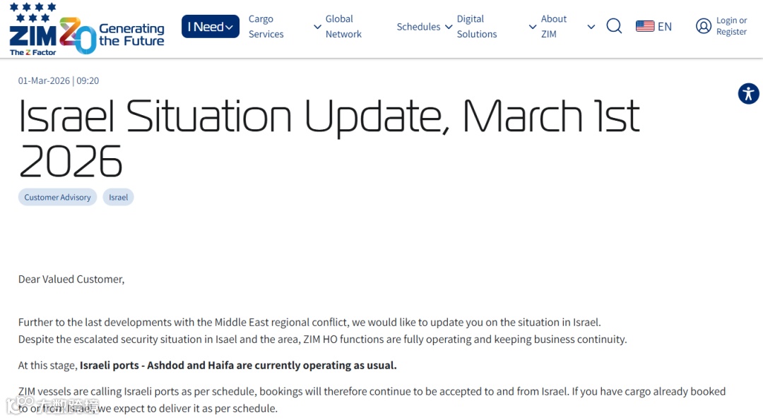 阿什杜德港与海法港的所有本地码头均正常运作,仅对危险货物(DG)运输存在部分限制,相关货物将逐案处理。