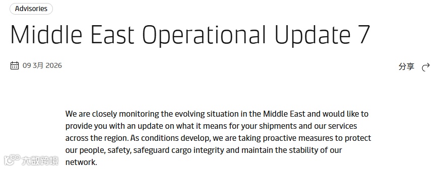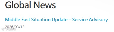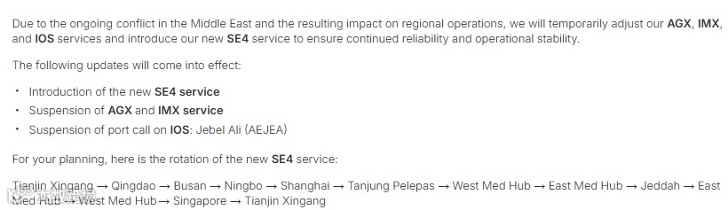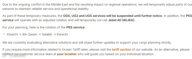 部分中东服务和港口运营受影响,可能导致时间表延误或路线变更,受影响服务的货物验收暂停。